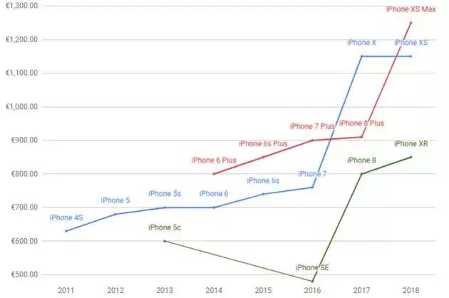如图我们可以看出,与七、八年前同样定位旗舰的iPhone4S的价格相比,苹果最新的旗舰iPhone XS Max几乎贵了一倍,即使是被称为“廉价版”的iPhone XR也远高于2017年发布的iPhone8。