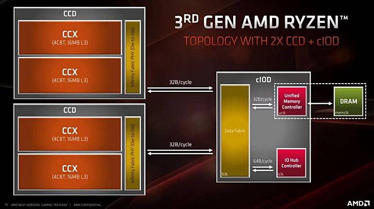 cIOD则是IO模块,不仅要负责对外连接,还要负责处理器核心之间的通信。值得一提的是两个CCD都采用了7nm制程,而cIOD则采用了12nm制程,如此组合也是充分考虑性能与成本的平衡,毕竟cIOD频率不高,12nm完全能满足设计需求。