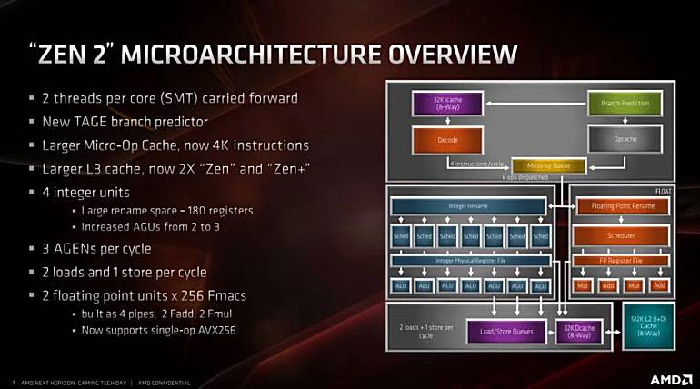 ZEN 2继续支持SMT技术以实现一个核心两个线程;配备了新的分支预测器;更大的微操作缓存,现在支持4K指令集;更大的三级缓存,两倍于ZEN和ZEN+;每个Cycle可以实现2个负载和1个存储;双浮点单元×256Fmacs,双倍浮点与负载存储带宽,4条流水线设计,包括双浮点加法和双浮点乘法(乘法操作延迟从4加速到3),现在支持单操作AVX256。