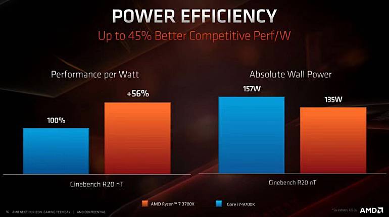 同时,7nm也带来了功耗的大幅降低,ZEN 2的每瓦性能相比同级竞品提升了56%之多,功耗却明显要低很多,例如AMD锐龙7 3700X的满载功耗就比Intel酷睿i7 9700K低了22W。