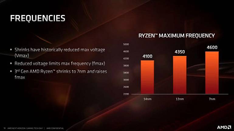 7nm工艺还大大提升了ZEN 2架构的频率上限,同时也降低了所需的电压,目前ZEN 2的最高加速频率可达4.6GHz。