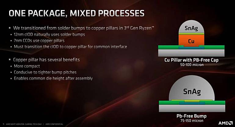 在7nm的CCD部分,ZEN 2采用了Cu Pillar with PB-Free Cap的封装方式,这种方案规格为50~100micron,而12nm的cIOD部分原本计划采用Pb-Free Bump方案,规格为75~150micron,但后来也决定改用Cu Pillar方案。毕竟Cu Pillar方案更紧凑、也方便封装后高度与CCD一致。特别值得一提的是,ZEN 2处理器采用高达12层的布线,同时cIOD的位置也进行了优化,提升了对高频内存的兼容性。