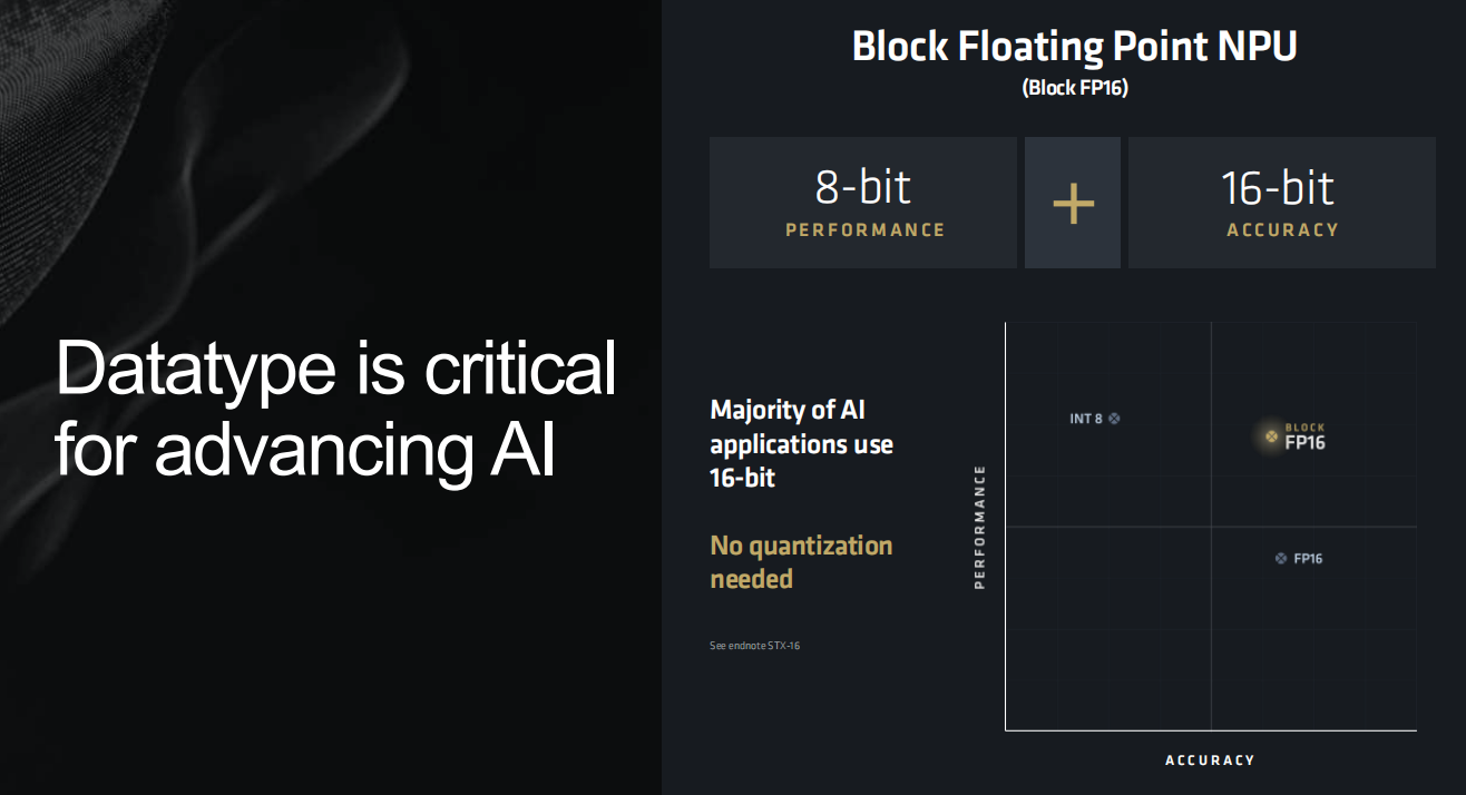 接下来介绍的Block Floating Point模式可以算是XDNA 2的终极奥义了。我们知道,目前的AI应用有两种常见的数据精度,大多数AI应用使用了16bit的精度,也就是FP16(16bit浮点)模式,而移动平台为了更高的效率一般会采用8位精度,也就是INT8(8位整数)模式。很显然,FP16拥有更高的精度,而INT8则拥有更高的效率,那么有没有办法两者兼得呢?AMD为XDNA 2配备的,就是兼具两者性能与精度优点的Block FP16模式。