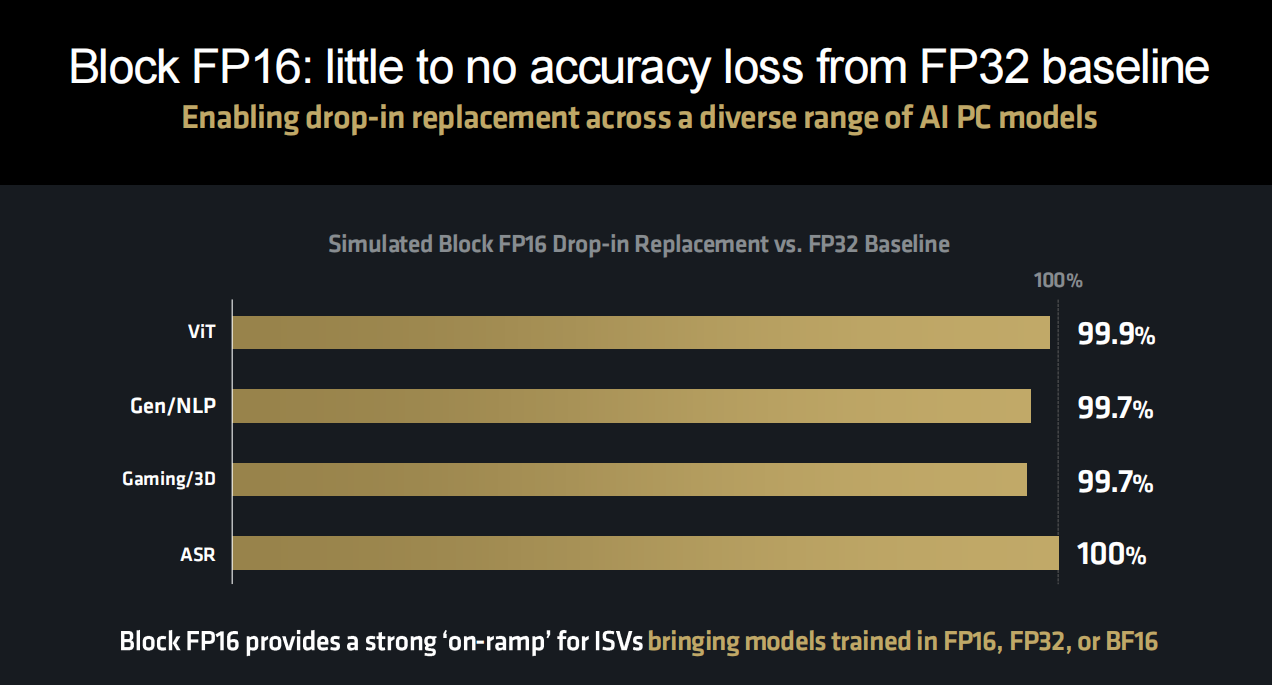 从AMD官方数据来看,Block FP16吞吐量几乎持平INT8/W8A8,大约两倍于INT8/W8A16——很明显INT8在处理8位权重和16位激活的数据类型时是远不及Block FP16的。在9位存储的模型体积方面,Block FP16只比INT8略高,远低于FP16,这也有效节约了存储空间。在16bit精度方面,使用LIama2-7B模型测试,Block FP16可以达到FP16大约99.9%的精度,比INT8/W8A16更高,更是高出INT8/W8A8一倍。由此可见,Block FP16结合了INT8的高性能与FP16的高精度优势,让XDNA 2架构打造的第三代Ryzen AI NPU能够发挥出遥遥领先对手的AI算力。实际上,我们从图上还可以看到,Block FP16即便是和FP32基线相比,也几乎没有什么精度损失,这也就意味着Block FP16给ISV们带来FP16/FP32或者Block FP16训练的模型提供了一条强力的“匝道”。