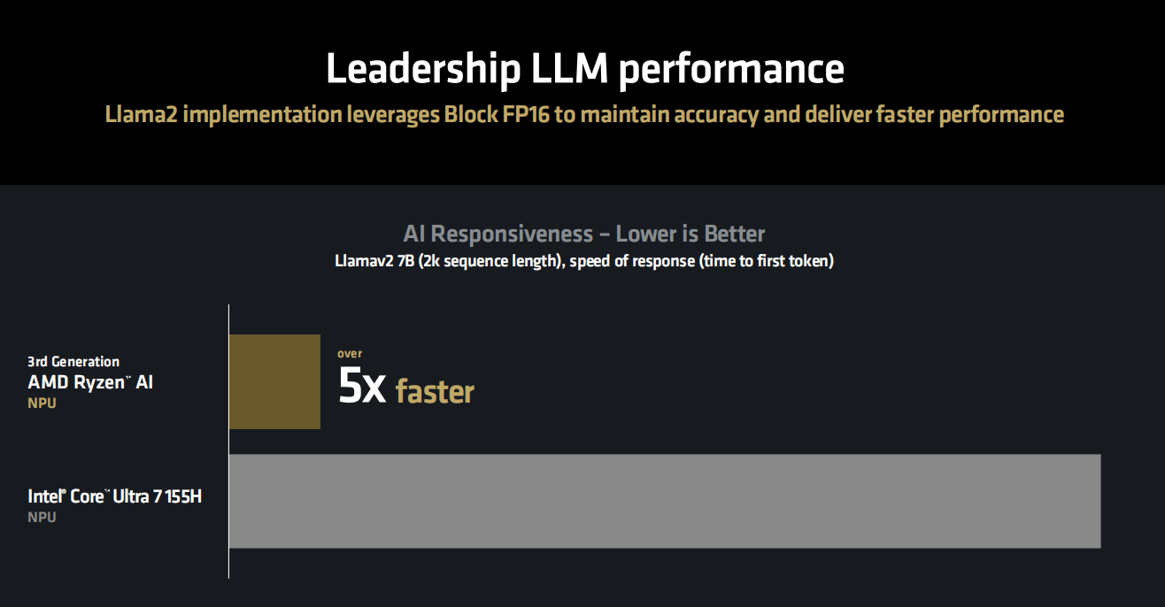 LIama2大语言模型也可以利用Block FP16来同时提供高精度和高性能,从AMD官方数据来看,在基于LIama2 7B模型的AI响应速度对比中,XDNA 2架构的Ryzen AI NPU可以提供五倍于竞品酷睿Ultra 7 155H内置NPU的响应速度。