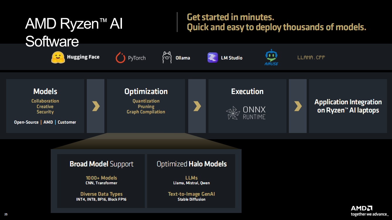 对于开发者来讲,可以非常轻松地利用Ryzen AI开发出成千上万的模型。Ryzen AI拥有更广的模型支持度,支持1000+的模型,包括CNN和Transformer,支持不同的数据类型,包括INT4/8以及Block FP16、FP 16等等。同时也优化了Halo模型,支持LIama、Mistral、Qwen大语言模型和Stable Diffusion文生图。在执行端,Ryzen AI也支持ONNX运行时,最终打造出运行在锐龙AI笔记本上的应用合集。