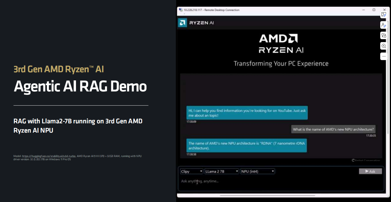 在本地检索增强生成(RAG)演示中,使用LIama2-7B模型的RAG可以在第三代Ryzen AI NPU上完美运行,当然,用户也可以随时给本地RAG“喂”上更新的资料,让它在回答问题时能够提供更加准确的结果。