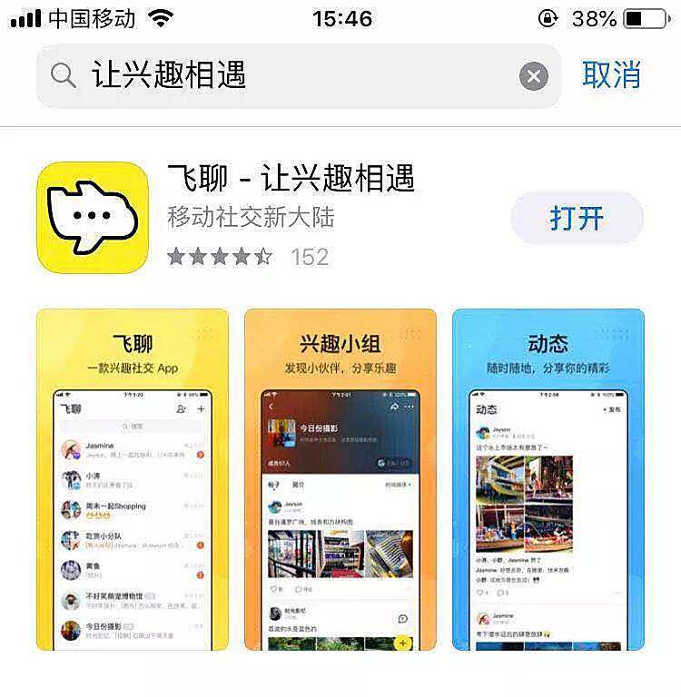 王二小去App Store下载体验了一下,看看飞聊APP到底好不好用。测试发现,在App Store里面搜索“飞聊”找不到该软件,搜索“让兴趣相遇”才能搜到飞聊APP。