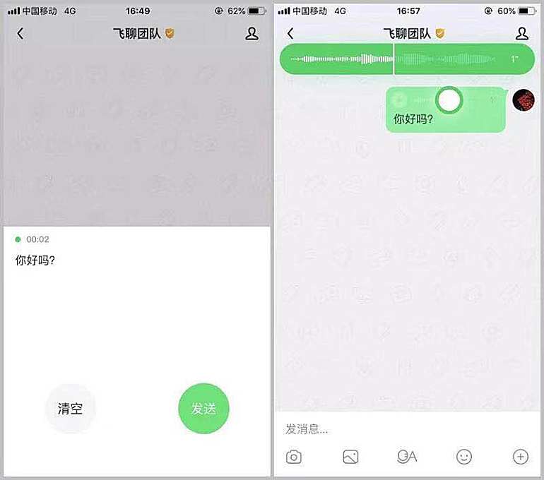 在主要的聊天功能上,飞聊是微信和子弹短信的结合体,像微信一样可以发语音,像子弹短信一样可以自动语音转文字,并拖动语音条进度播放。
