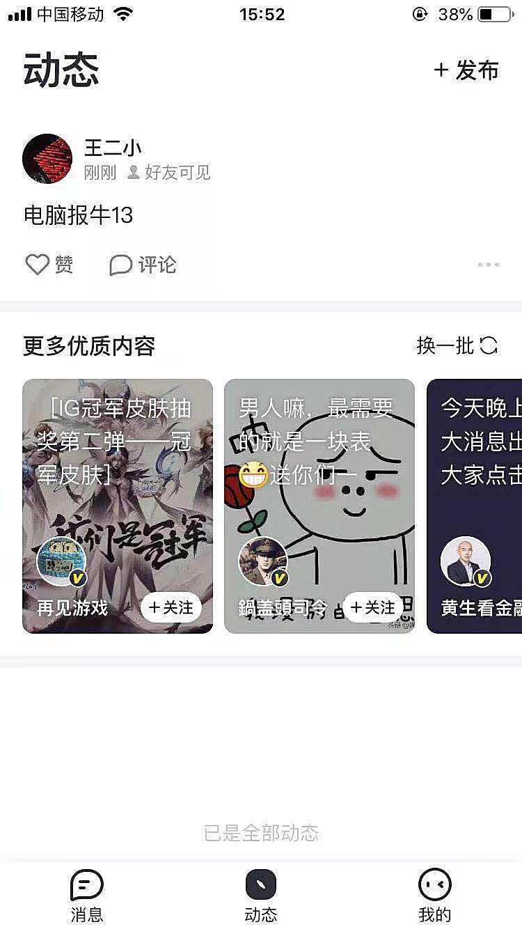 再看菜单“动态”的设置,也是以信息流展示,像是微博+朋友圈的结合体,继包含自己和好友所发动态,也会有大数据推荐的动态。页面展示效果和今日头条上的“微头条”推荐短视频非常相似,都是以竖屏推荐。