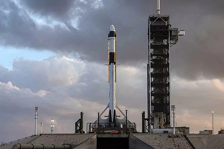 猎鹰9火箭矗立在发射台上,火箭顶部是载人版龙飞船