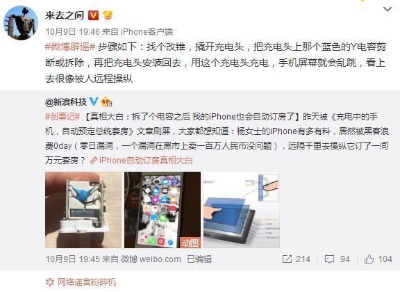 随即,新浪微博CEO@来去之间 也转发了这条微博并标注了#微博辟谣#标签。至此,这起困扰了网友以及安全专家们的离奇谜案也算解开了。还是老生常谈,如果有条件的话,还是尽可能使用原装充电器和数据线吧,除非,你的心脏足够强大。
