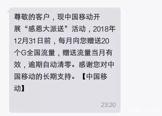 而在免费赠送流量方面,近期移动开启了一个针对老用户送流量的活动,这个活动叫做“感恩大派送”,被告知的老用户在今年年底前,每个月可以免费获赠20GB的全国流量,不会限制速度,但流量只是当月有效,不能流转到下个月。