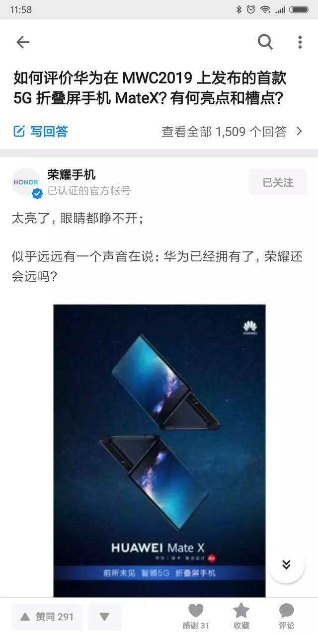 今日,有知友在知乎提问“如何评价华为在MWC2019上发布的Mate X”。对此荣耀手机官方认证帐号表示,太亮了,眼睛都睁不开,似乎远远有一个声音在说,华为已经拥有了,荣耀还会远吗?显然荣耀在暗示旗下首款可折叠屏手机即将登场,不过关于这款折叠屏的更多信息暂时还不清楚。