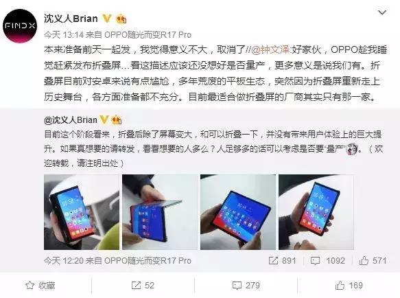沈义人还特别强调这款折叠屏是OPPO自研的方案,原本计划在23号OPPO 2019 创新大会发布。
