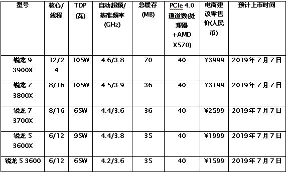 第三代AMD锐龙台式机处理器参数以及上市时间: