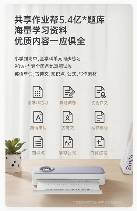 依托于作业帮在教育领域多年的深耕,喵喵机学习打印机F2S内置的海量学习资源,做到从小学到高中基础教育全阶段,语文、数学、英语等学科的全覆盖,真题试卷、练习题、模拟题等多种试卷类型,同步更新,保证真题“新鲜度”。