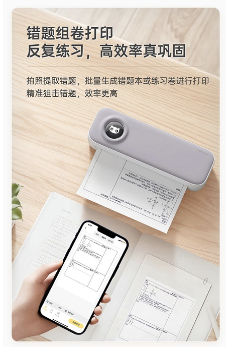 将笔记内容和没有掌握的错题及时拍照,喵喵机学习打印机F2S会将图片中的内容进行识别,按照年级、学科、难易程度等维度进行归纳分类,轻击打印按钮,一份专属于你的错题集就会打印出来。