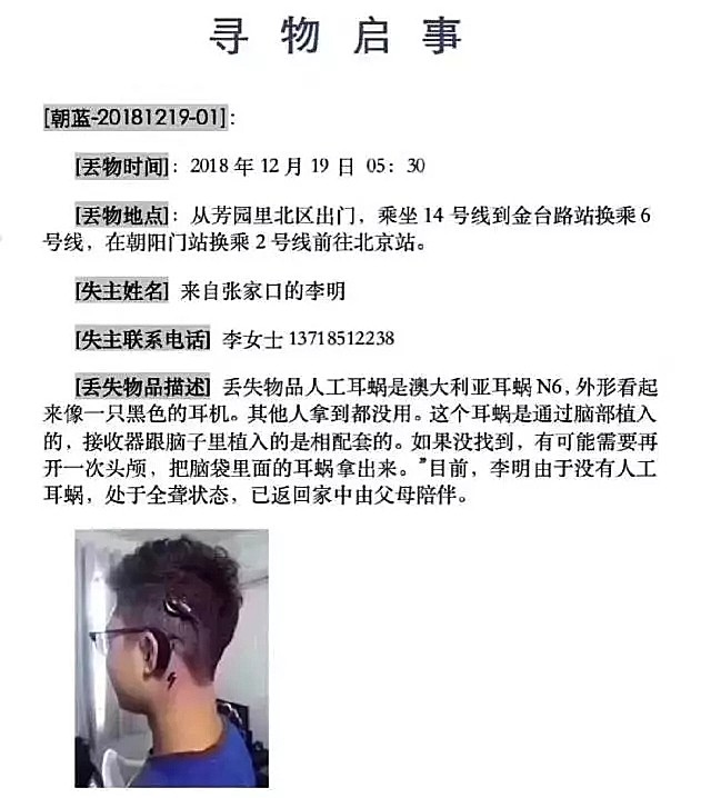 昨天,有网友发布消息称,她弟弟的人工耳蜗丢失,“早上5点半他从芳园里北区出门,乘坐地铁14号线到金台路站,换乘6号线,在朝阳门站换乘2号线去北京站,把人工耳蜗弄丢了,目前人是全聋状态,紧急求助!这个耳蜗大概价值20多万,是跟他脑子里的植入相配套的。如果没找到,他可能需要再开一次头颅。跪求所有人帮我转发……”