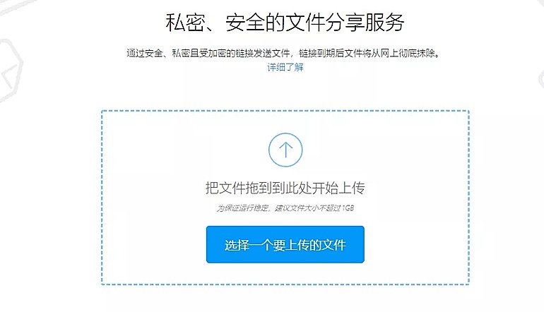 Firefox Send(https://send.firefox.com/):通过服务的名称我们就可以猜出该网络硬盘服务,它是由火狐浏览器的开发商推出的。该网络硬盘服务最大的特色就是“私密”,所有分享的文件在被用户下载一次后就会自动删除,或者在存储24小时后没有下载的话也自动删除。