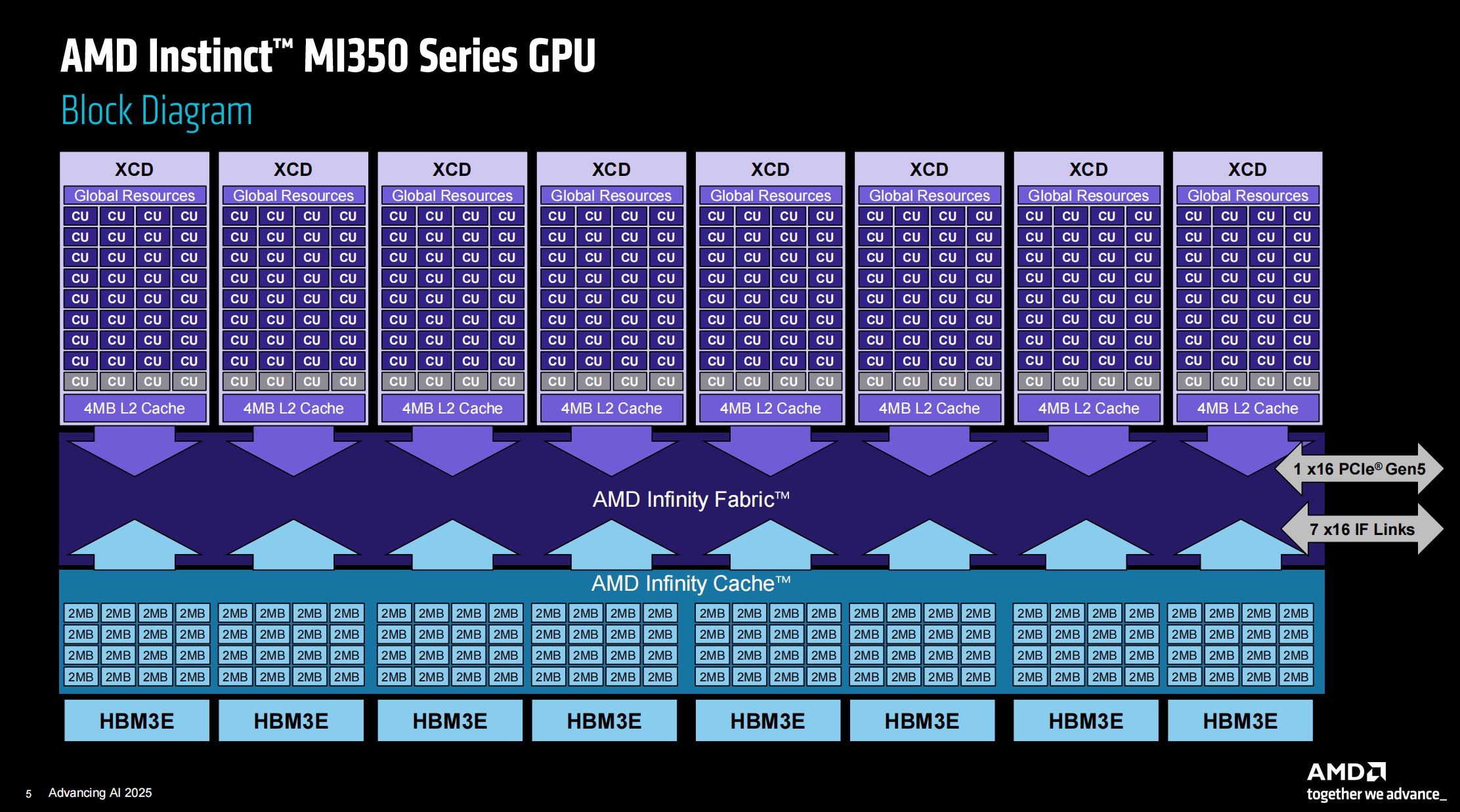 另外,从MI350系列GPU的Block Diagram图片可以看到,1个XCD原生拥有36个CU单元,而MI350系列用了其中32个,因此总共具备8×32=256个CU,每个XCD具备4MB二级缓存。IOD里具备128MB无限缓存,8个HBM3E控制器每一个对应32MB无限缓存。XCD和IOD对外通过IF总线与PCIe 5.0总线进行数据传输,其中对外的IF总线有7路。