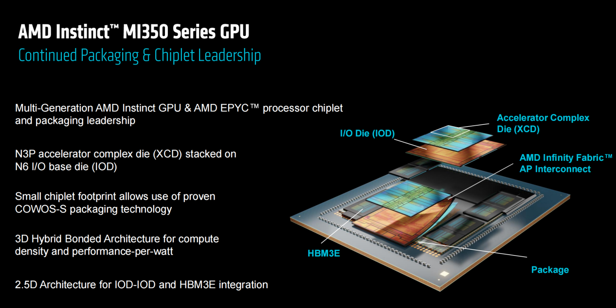 从图中可以看到,MI350系列采用了XCD芯片与IOD堆叠的方式,其中XCD采用了N3P制造工艺,而IOD使用N6制造工艺,成熟的COWOS-S封装技术在这里发挥了优势。在IOD之下,是AMD Infinity Fabric AP Interconnect单元,不同GPU和不同XCD通过IF总线进行互联,3D混合键合架构提供了更佳的能效表现。IOD-IOD、HBM3E显存则采用2.5D架构封装。
