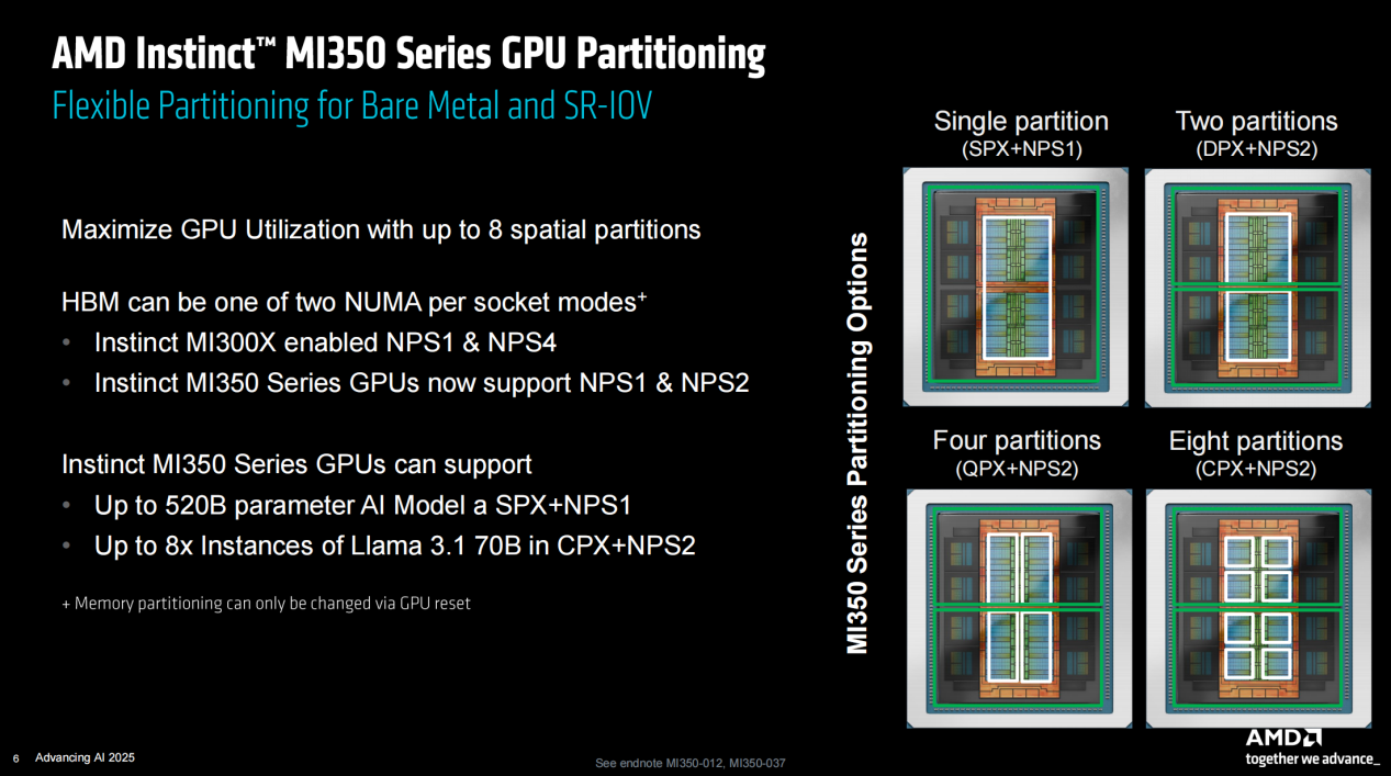 值得一提的是,MI350系列也支持GPU分区模式,同时HBM显存也支持NUMA划分。不过和MI300X支持NPS1和NPS4模式不同的是,MI350的HBM显存支持的是NPS1和NPS2模式。也就是说MI350系列支持GPU单分区+NPS1模式、GPU双分区/四分区/八分区+NPS2模式。从AMD官方数据来看,MI350系列在GPU单分区+NPS1模式下可获得最大显存容量,因此可支持520B参数的AI模型,而在GPU八分区+NPS2模式下可最多支持8个Llama 3.1 70B模型实例。