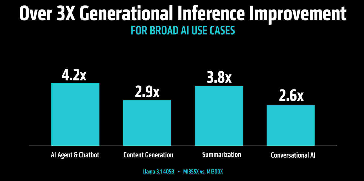 来看看AMD官方提供的具体数据。MI355X在加载运行Llama 3.1 405B大模型时,AI助手和聊天机器人、内容生成、摘要与对话式AI的推理性能分别相对MI300X提升了320%、190%、280%和160%之多。