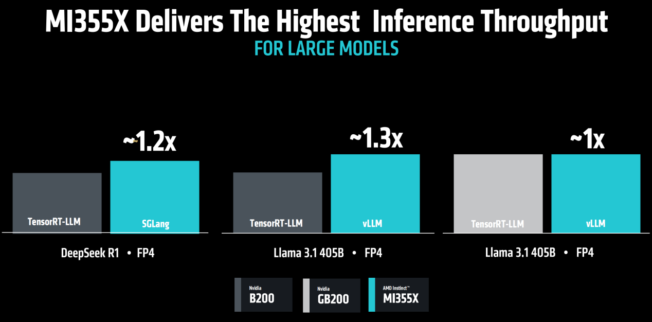 使用DeepSeek R1模型,和B200在FP8精度下对比的话,有ROCm 7加持的MI355X吞吐量可以领先30%之多。