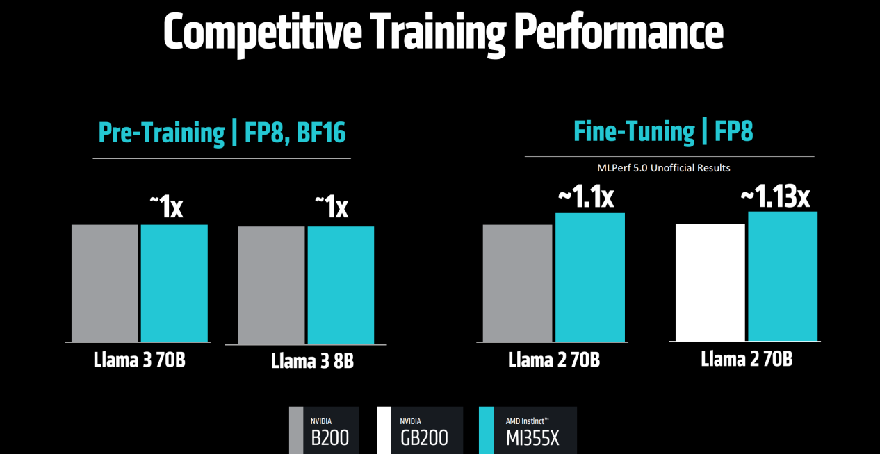 和竞品对比,MI355X在FP8/BF16下预训练Llama 3 70B/8B模型与B200的性能相当,而在FP8精度下微调Llama 2 70B时的性能大约是B200的1.1倍、GB200的1.13倍。由此可见,MI350系列在综合性能和性价比方面相对竞品有着明显的优势,考虑到AMD还能提供从CPU、GPU到平台系统最为全面的解决方案,说它在业界中具备领军级的实力毫不为过。
