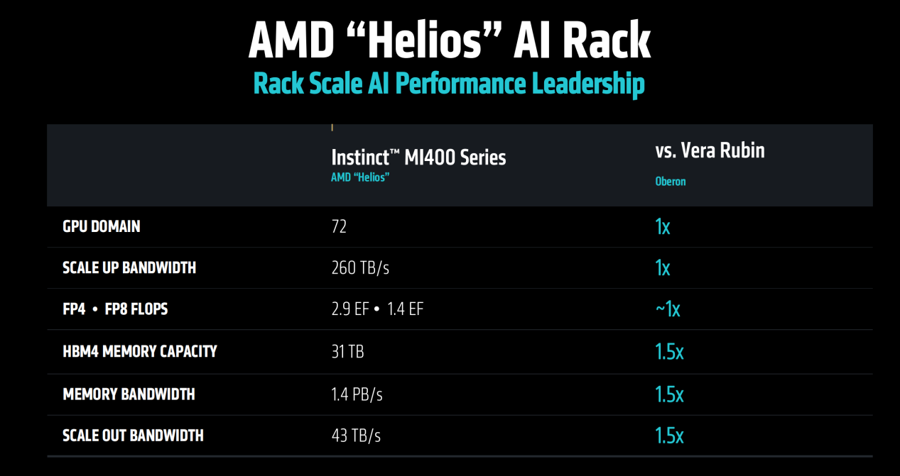 MI400系列组建的机架(代号Helios)最高支持72个GPU,FP4/FP8性能分别可达2.9EFLOPS和1.4EFLOPS,下HBM4显存容量高达31TB,显存带宽和扩展带宽分别达到1.4PB/s和43TB/s。AMD也放出了它和Vera Rubin的理论性能对比,看起来也是优势非常明显的,特别是显存容量和带宽部分,都领先了50%。