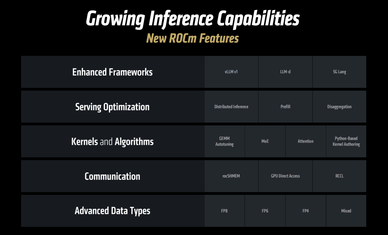 ROCm 7增强了推理能力,增强了框架、优化服务、支持新内核和算法、支持更多的数据类型。