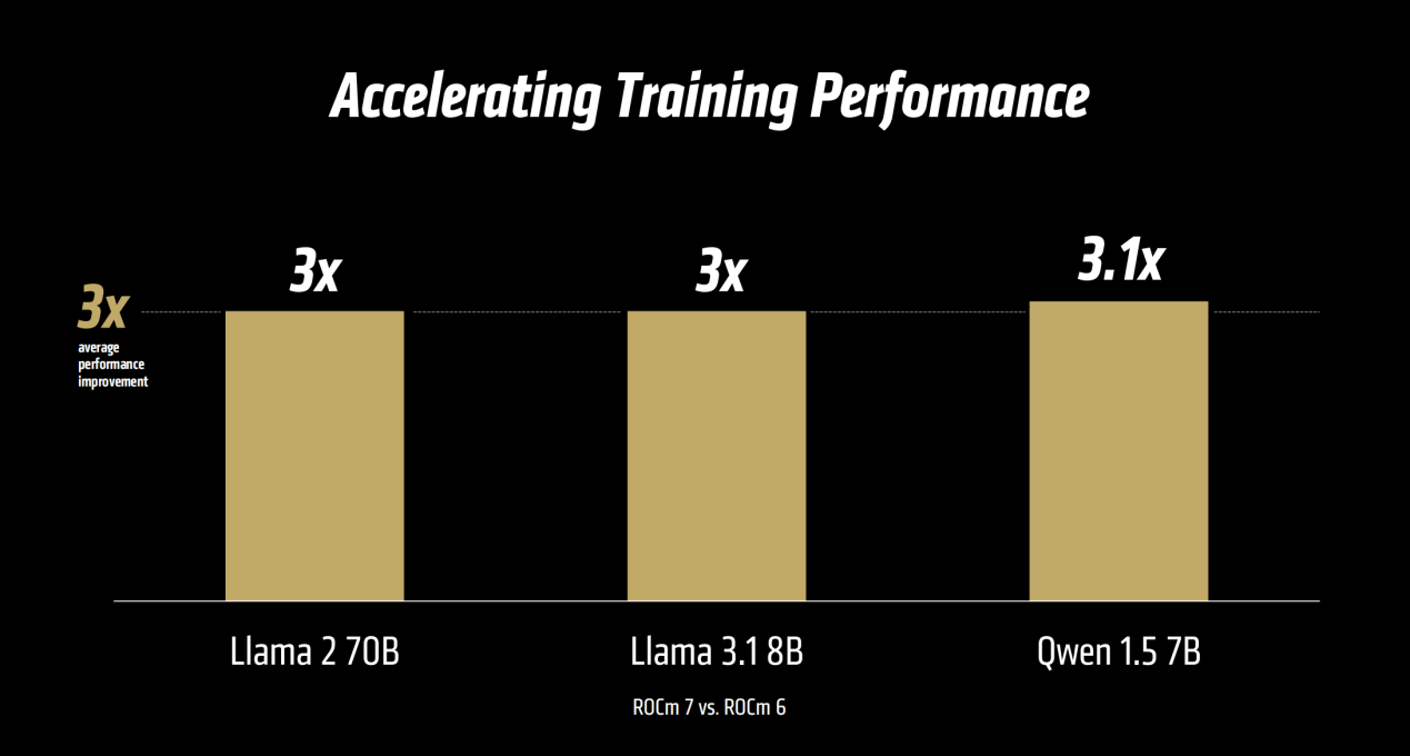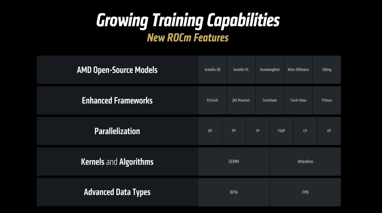 ROCm 7的训练能力也得到大幅增强,支持更多的AMD开源模型、增强框架、更强大的并行能力、更优化的内核和算法、支持BF16和FP8等高级数据模式。