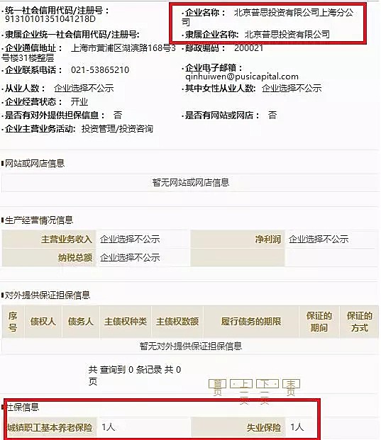 在国家企业信用信息公示系统可查找王思聪以2000万元注册成立了北京普思投资有限公司,在其2018年4月17日公布的2017年年报中(由于是未上市公司,年报是自愿提交并上传),社保信息处显示公司为10名员工交了五险一金,而根据普思资本的组织架构,不算王思聪,再除去4名高管+3名部门负责人,普通员工就只剩下3人,刚好一个部门一个?更奇怪的是北京普思投资有限公司上海分公司,该公司2018年5月4日公布的2017年年报显示,公司名下缴纳社保的就一个人!