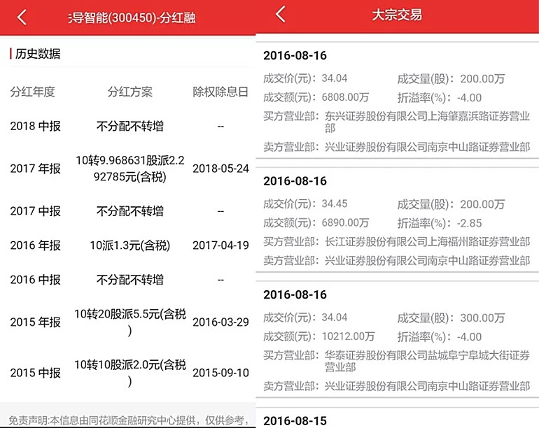 而紫盈国际有限公司于2016年8月15日至2016年8月17日期间通过深圳证券交易所大宗交易系统减持全部股份。锌刻度(ID:beefix)查询这期间一共有5笔大宗交易,成交价格从33.92~34.54元不等,其中4笔的价格在34元附近,不过这5笔成交加起来的减持股票数量达到1237万股,而紫盈国际有限公司持有的股票数量为1055.34万股(经历过1次每10股转10股、1次每10股转20股),很明显还掺杂了其他股东进行减持,无法做到精准计算,那么保守计算紫盈国际有限的减持平均价格为34元,减持总金额就是约为3.59亿元。