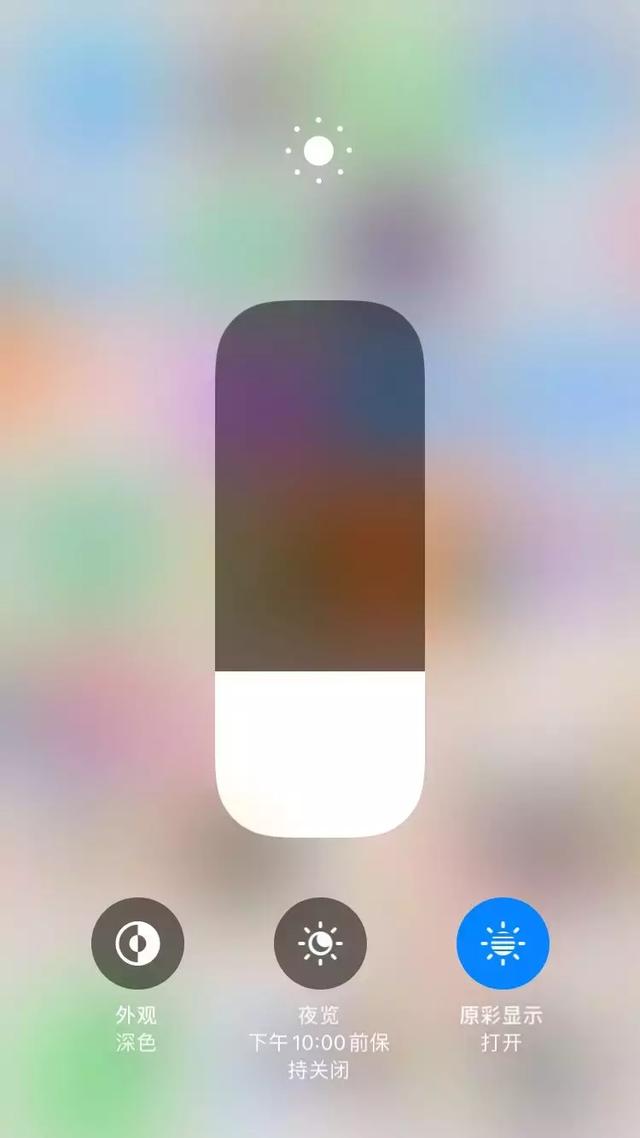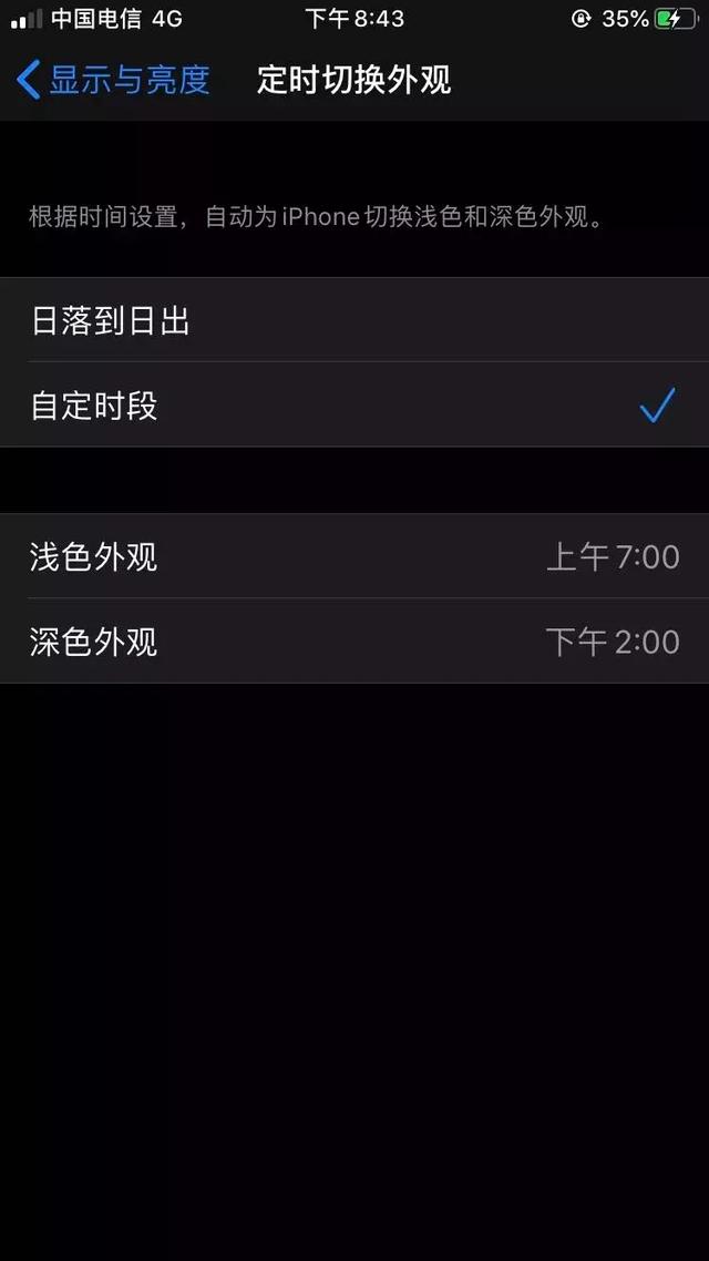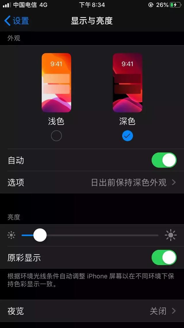 除了可以在显示与亮度中开启深色模式,也可以长按控制中心中的亮度条快速切换,还能根据当地日落到日出时间或者自定时间段,让它自动切换。