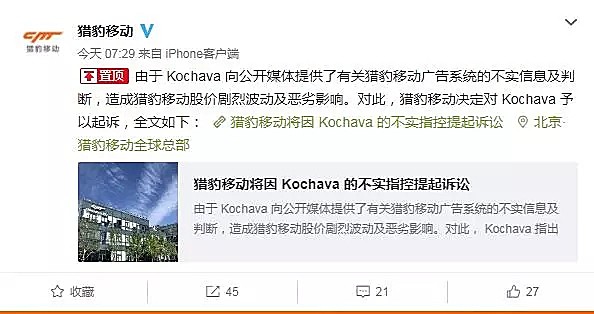 猎豹回应:与事实不符,将起诉Kochava