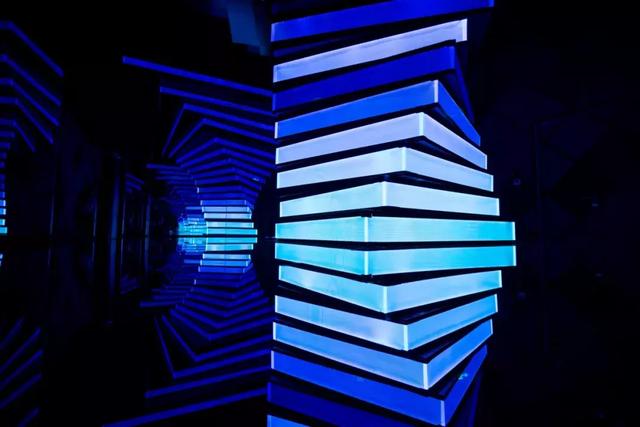 不同于苹果、小米、华为等厂商的零售店,vivo Lab带有很明显的vivo血统。一层的室内设计充分运用了vivo的品牌色——vivo蓝,以“Blue Core”为设计语言,打破了目前行业惯用的视觉及材质风格。通过大量有色玻璃、金属、镜面等材料,展现了vivo对科技探索与先锋时尚的追求。