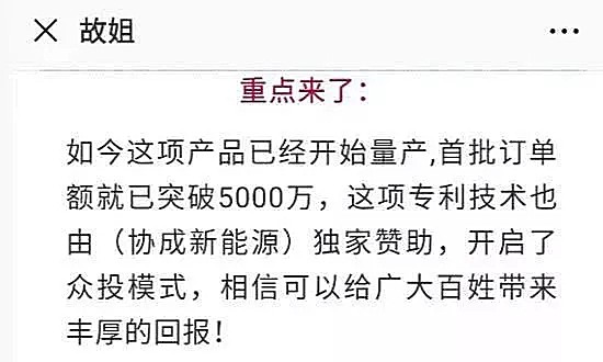 故姐接着介绍称,如今这款插线板已经开始量产,首批订单额就已突破5000万,这项专利技术也开启了众投模式,并号召大家购买以实现财富自由。
