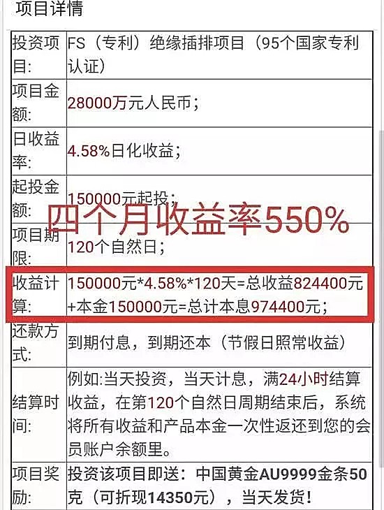 根据项目详情,该项目日利率4.58%,投资四个月15万变97万,年化收益率1664%,并且现在充值还送价值14350元的金条一根。这个利益率就很吓人了,比“贩毒”还高。