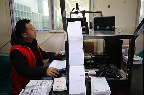 ▲渭南邮政电商工作人员正在打单。消费者下单,邮件处理中心即打,工人在传送带上即贴,邮政的物流车装满即发。全流程中,好几个环节真正以秒计算,开创了领先全行业的秒发模式。