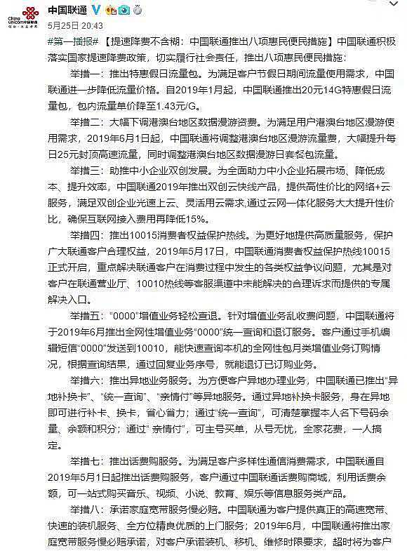 昨日晚,中国联通也发出公告,宣布八项便民措施出炉,并引来网友纷纷点赞。具体如下: