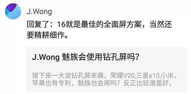 对此,有网友此前在魅族社区发帖:接下来一大波钻孔屏来袭,荣耀V20、三星S10、小米等,魅族也会使用吗?让人意想不到的是,魅族科技创始人黄章予以回复:16就是我心中的最佳全面屏方案,当然还要精耕细作。