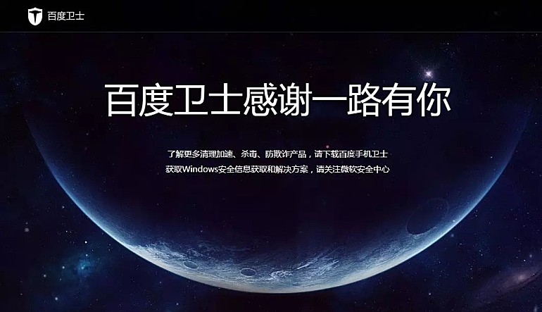 此外,官网页面还显示“了解更多清理加速、杀毒、防欺诈产品,请下载百度手机卫士”及“获取Windows安全信息获取和解决方案,请关注微软安全中心”等文字。