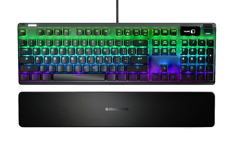 Apex Pro系列机械键盘的框体由航空级铝合金材质打造,坚固耐用。其每颗按键均带有动态RGB灯光照明,支持赛睿PrismSYNC灯光同步技术。键盘本身可存储5个板载配置文件。此外,它还集成了可用于扩展的USB端口,并标配舒适的磁吸附手腕托架。