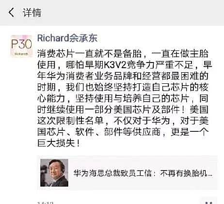 余承东在朋友圈中直言不讳地表示,“消费芯片一直就不是备胎,一直在做主胎使用,哪怕早期K3V2竞争力严重不足,早年华为消费者业务品牌和经营都最困难的时期,我们也始终坚持打造自己芯片的核心能力,坚持使用与培养自己的芯片,同时继续使用一部分美国芯片及部件!美国这次限制性名单,不仅对于华为,对于美国芯片、软件、部件等供应商,更是一个巨大损失!”