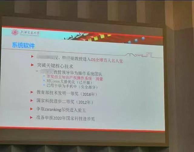 而且,昨天晚上,微博上一名网友曝光了上海交通大学的一份PPT演示,在这份名为系统软件的幻灯中可以看到由某教授领导华为操作系统团队开发了自主产权操作系统——鸿蒙。