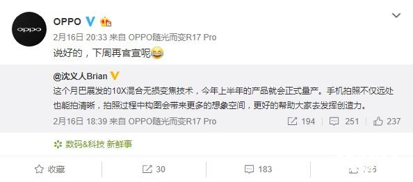 加上OPPO副总裁在16日晚抢先透露了10倍混合光学变焦技术将在今年上半年的新产品中正式量产的消息,令OPPO官微猝不及防并且回复到:“说好的,下周再官宣呢?”其实这一波操作不仅使得OPPO官微猝不及防,也使得OPPO一大群粉丝用户倍感惊喜。