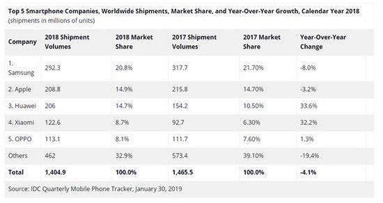 根据此前IDC发布的数据,华为+荣耀在2018年里共出货1亿500万台,占市场份额26.4%,同比增长15.5%。而与此同时,三星以2.923亿部的全年出货量虽然继续占据全球第一的位置,但市场份额同比下滑了8%,只占20.8%。苹果以2.088亿部出货量排名第二,但同样持下滑趋势,与前一年销量相比下滑了3.2%,目前的市场份额是14.9%。