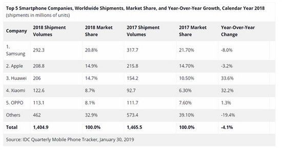 全球前五名中,除了华为之外,小米也实现了同比30%增长的增速。2018年,小米出货量达1.226亿部,市场份额8.7%,同比增长了32.2%。